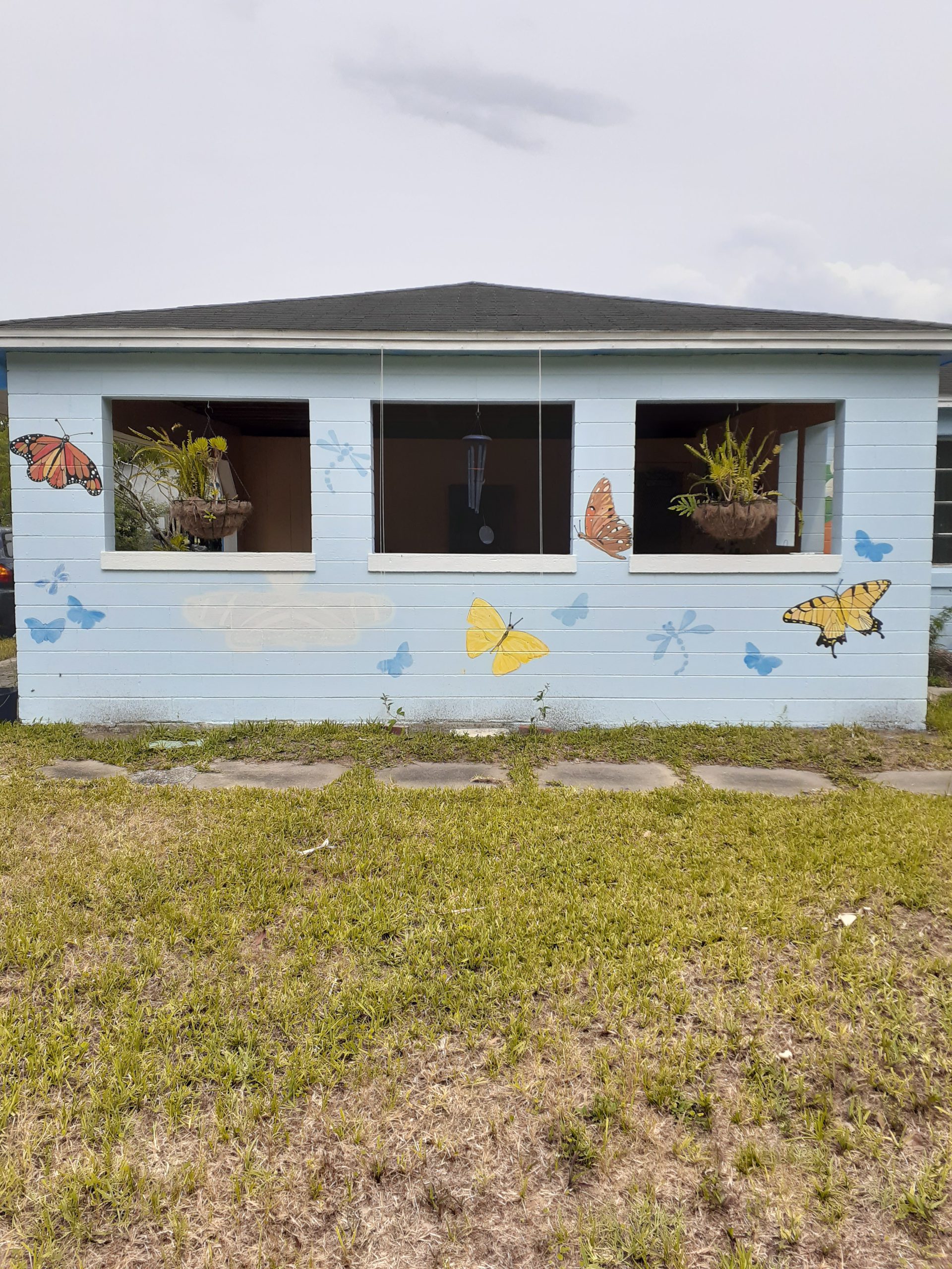 After adding a butterfly to the North wall I was inspired to add a few to the front wall of the house, nothing too big. With that concept in mind I thought of the variety of butterflies that I’d seen in our garden and decided that those would be the ones I’d showcase: Monarch, Zebra (the Florida state butterfly), Yellow Sulfur (we see them almost all times of the year mostly in Spring and yellow is my mom’s favorite color), Fliterary, and the Tigertail butterfly.