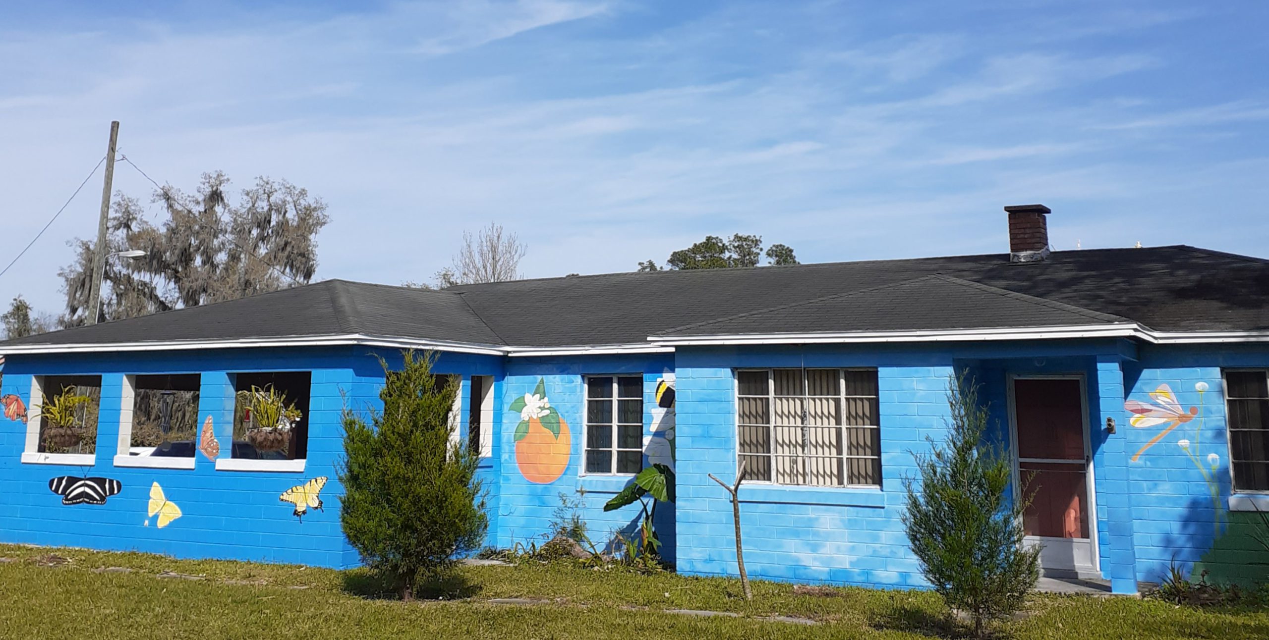 If you read my “Sunflower Mural” post, you may recall I mentioned there were more sides of the house to use as canvass. As you can see by the picture of the front of the house, anything would be an improvement.
