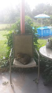 Below you will see pictured -Miss Helen (1 of our 4 cats), she enjoys coming out to the back patio to have coffee with me in the mornings… peaceful. It’s our girl time together.