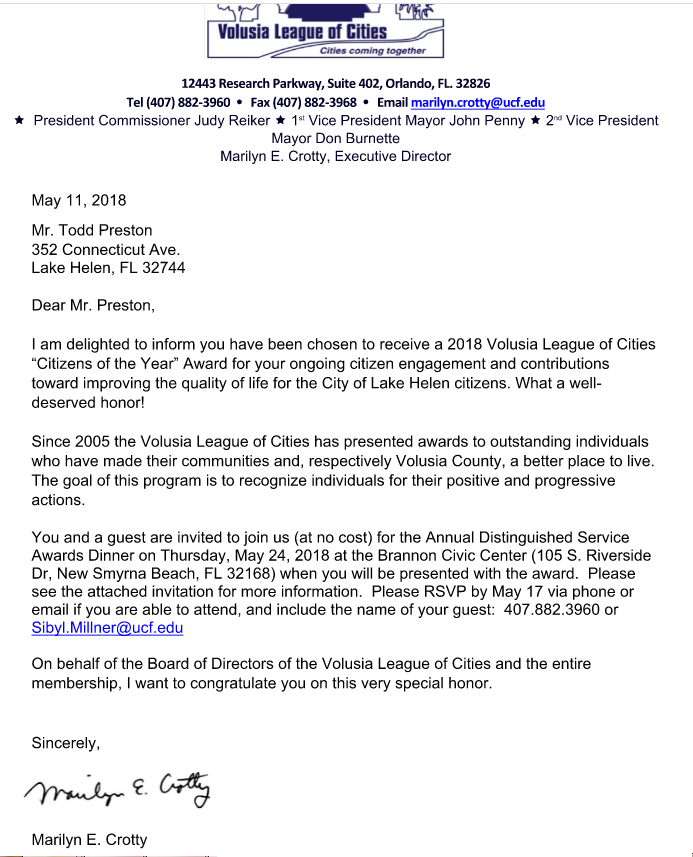 So much was Mr. Ex’s contribution throughout the year that when the League of Cities requested the city of Lake Helen nominate a citizen to receive the “Citizen of the Year”- it was I who brought up Mr. Ex’s name to be submitted. Not one on that 2017-2018 commission considered nominating a citizen, it was I who thought of our people and selected a citizen. The commissioners were more focused on staff picks.